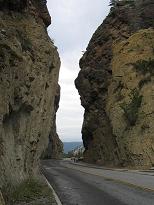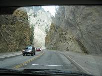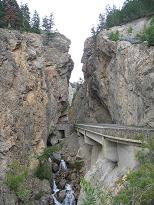 This route will take us west from Lake Louise through Yoho to Golden, BC, then south to Radium Hot Springs, BC, where we turn west back through Kootenai to Banff. I have no idea how long the loop actually is, but it is probably about 250 km. Right over the line in Yoho, we see signs for the Spiral Tunnels. Having no idea what that means, we figure we should at least stop and read the signs. It seems that the pass from Yoho to Lake Louise is a bit steep for most trains. The current road more-or-less follows the old rail route and it descends at about an 11% grade. An innovative way to solve the grade problem was to use a European idea to build two spiral tunnels, allowing the trains to make switch-backs up the pass. The tunnels work just like you are thinking they do: the train enters at the bottom and then turns counter-clockwise, making a full circle. When the engine emerges, from the other end of the tunnel, it is about 15 meters higher than the entrance of the tunnel. It then passes over the lower tunnel entrance on its way up the mountain. In this location, the train then doubles back and goes through a second spiral, which turns clockwise. We sit there with a growing crowd of people waiting for the opportunity to see a train go through the tunnel that is visible from the road. After about 15 or 20 minutes, we are pretty bored with this process and getting more concerned about the length of the trip, so off we go. Surprisingly, we do not see the train appear in our rearview mirror, as we pull away. Murphy must be on vacation, too. From here, it begins to rain, which is really a good thing. If it were sunny, we would pull over at every chance to take pictures. However, with the rain and very low ceiling, the pictures are not that interesting, so we make better time. That is my story and I am sticking to it. The trip from the Spiral Tunnels to Golden is one of the slowest pieces of road we have ridden. It is very curvy, making right-angle after right-angle turn along steep cliff faces for most of the trip. This is really beginning to wear on me, as I think about how much time this is adding to our trip. If that were not bad enough, we have to go through a road block. The BC government is pulling over three drivers at a time to ask them a survey about road conditions. The young woman asked me what would make my trip better and I resisted telling her "not having to stop at some survey checkpoint". If they tried this back home, they would be rounded up like some witch hunt and burned at the stake. Grumble, grumble, grumble. In reality, it only takes about three minutes to pull over and answer their questions, so I should loosen up a bit. Yeah, I will get right on that. Besides, if it only took three minutes, how useful could the questions possibly be? Fortunately, after turning south in Golden, we leave all traffic and switch-backs behind. I can really put the pedal to the metal out here and Lea Ann can get some proper sleep. Even at somewhat high speed, this place reminds me of the Blue Ridge in Virginia. The main difference is that behind the foothills, real mountains rise up with snow and whatnot. There would be some really nice pictures along this route if that mysterious ball of flame would appear.